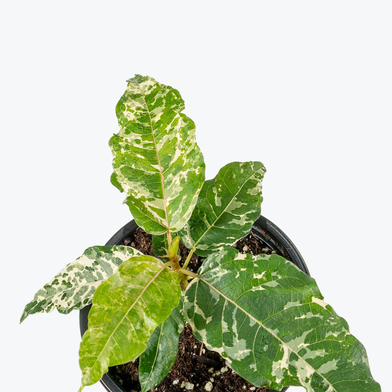 Fertilize your Ficus aspera 'Variegata' every 4-6 weeks during the growing season with a diluted, balanced liquid fertilizer. Pruning can help control its size and encourage fuller growth. Be mindful when handling, as the sap of Ficus plants can be irritating to the skin and toxic if ingested.