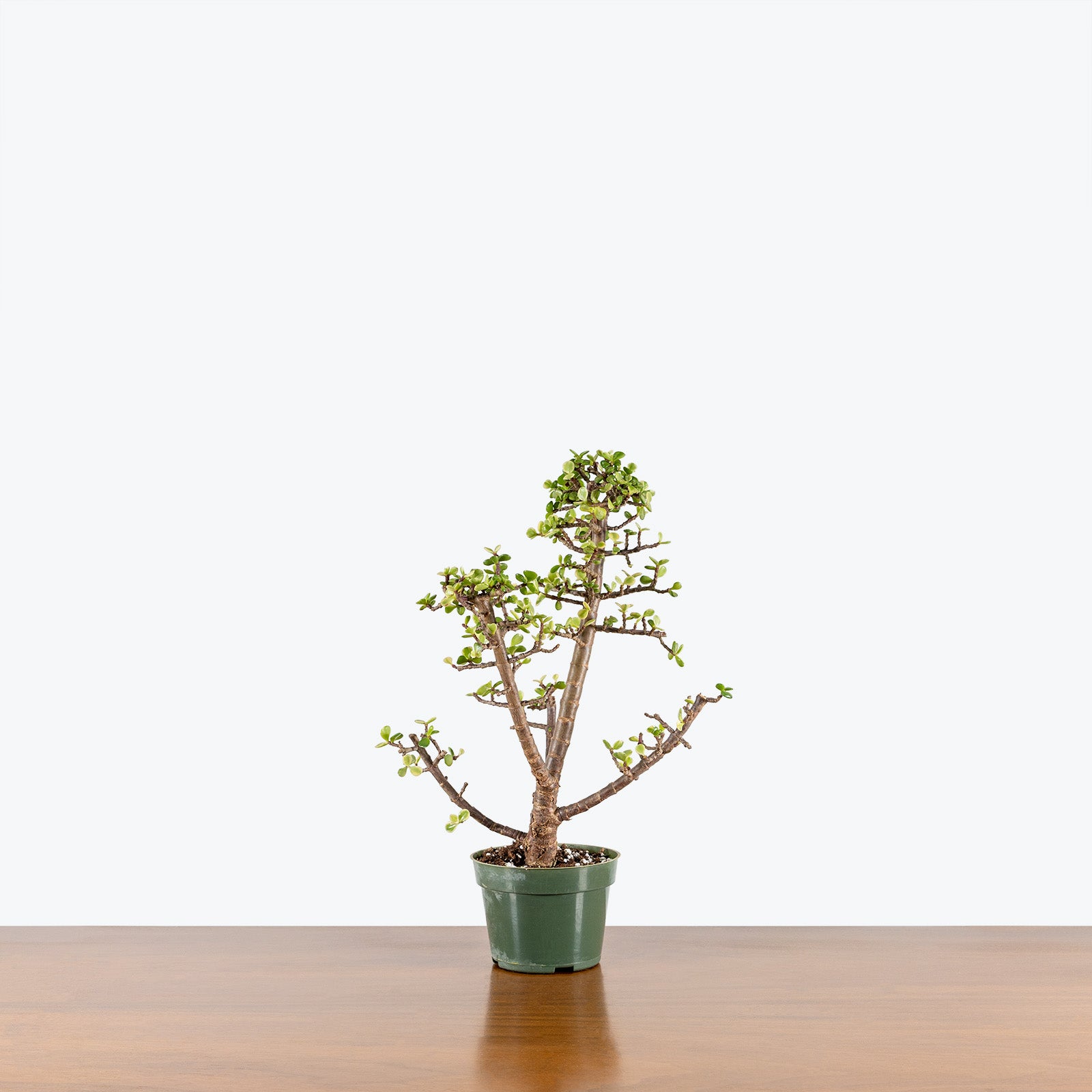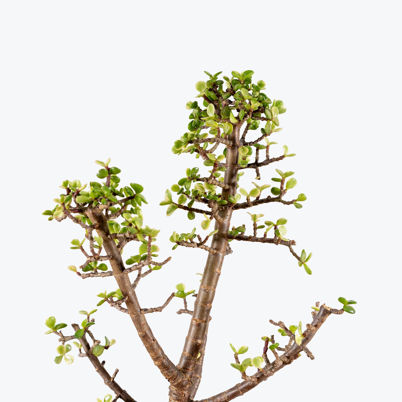 The Variegated Dwarf Jade Plant, aka Portulacaria afra 'Variegata', also known as the Rainbow Bush, is a visually striking succulent that brings a vibrant splash of colour to any collection. This variegated version of the traditional Dwarf Jade features a charming mix of green and creamy white leaves, sometimes tinged with pink hues, especially under strong sunlight or cool temperatures. Its small, round, and glossy leaves grow on woody, reddish stems, creating a delightful contrast. Compact and bushy, this slow-growing succulent is perfect for small spaces, making it an ideal choice for indoor gardens, desks, or as part of a succulent display.
