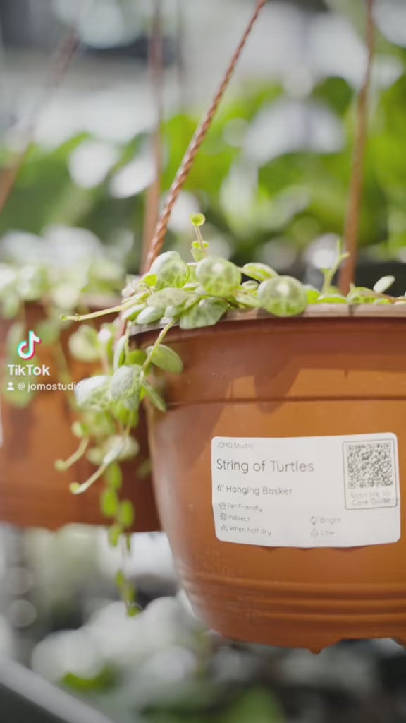 String of Turtles, scientifically known as Peperomia prostrata, is a charming and popular houseplant renowned for its unique and decorative appearance. This plant features small, round leaves that resemble turtle shells, complete with intricate, variegated patterns of green and silvery-white. The leaves are thick and waxy, growing on thin, trailing stems that can cascade beautifully over the edges of pots or hanging baskets. Native to the rainforests of Brazil, String of Turtles is an epiphytic plant, often growing on tree trunks in its natural habitat, which makes it well-suited for indoor environments with limited space.